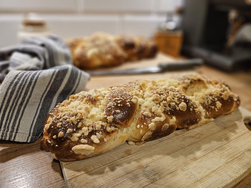 Jest biała mąka i masło, czyli to co lubię najbardziej 🙂 Ten słodki chlebek kojarzy mi się z dzieciństwem, spokojem i beztroską. Chałka wychodzi puszysta i z posypką. Znakomicie sprawdzi się jako śniadanie do szkoły dla dzieciaków, ale też jako deser czy alternatywa dla zwykłego pieczywa. Z tego przepisu otrzymujemy dwie chałki, mieszczące się w dużej formie do ciasta.
