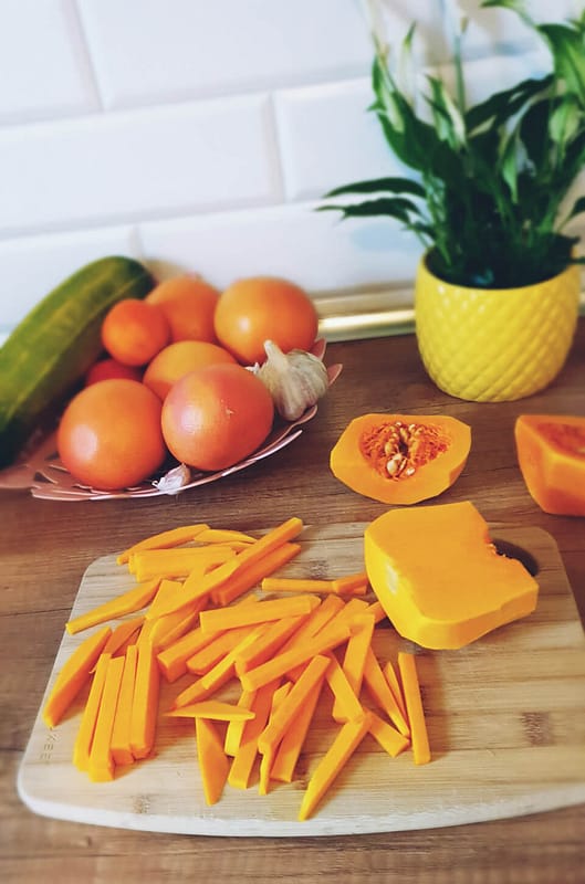 Frytki z dyni, nie dość, że świetnie smakują, to jeszcze są zdrowe i pożywne. Zawierają dużo błonnika, poza tym witaminy z grupy A, B1, B2, PP, E, C, magnez, cynk i selen.