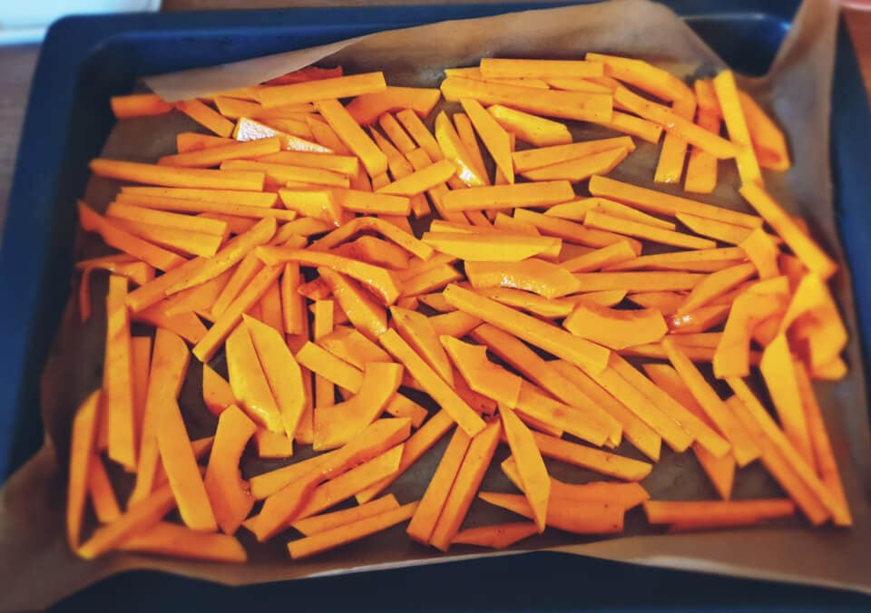 Dynię obrać, pokroić ją na frytki i położyć na blasze wyłożonej papierem do pieczenia. Frytki posypać mieloną papryką i skropić oliwą z oliwek.