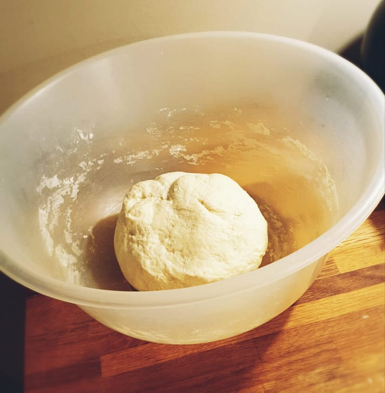 Do głębokiej miski wsypać mąkę, dodać wyrośnięte drożdże, szklankę wody, oliwę i sól. Zagnieść elastyczne ciasto. Powinno odchodzić od dłoni. Przykryć wilgotną ściereczką i odstawić do wyrośnięcia na około 15 min.