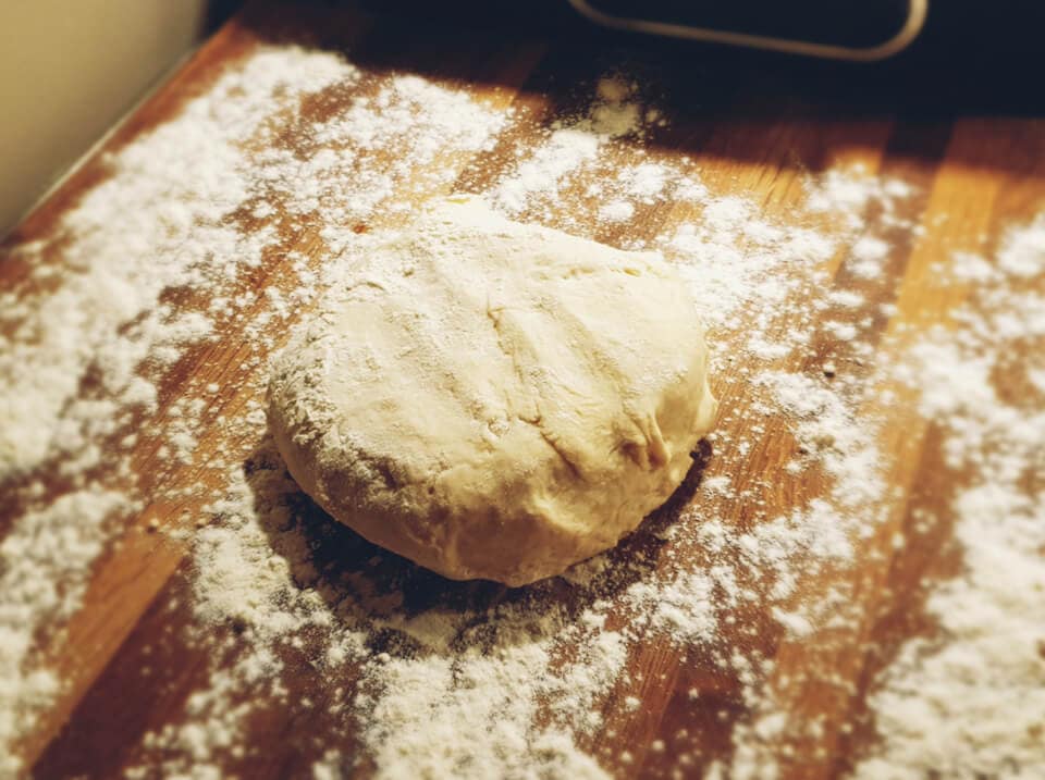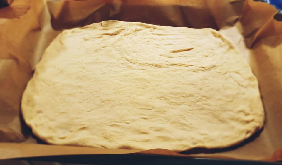 Po tym czasie podzielić ciasto na dwie części i rozwałkować dość cienko. Położyć na blasze wyłożonej papierem do pieczenia.